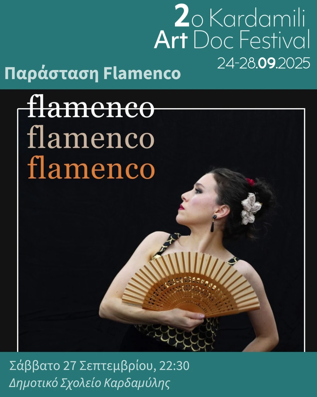 Old Primary School, KardamyliΤhe Spanish musical and dance form in its simple, yet essential form. The three fundamental elements that constitute the heart of this art - cante (song), toque (guitar), and baile (dance) - meet in a unique performance as part of the 2nd Kardamili Art Doc Festival. Thetis Missiou (dance), Kosmas Damianidis (guitar), Vangelis Chatziyiannis (vocals)