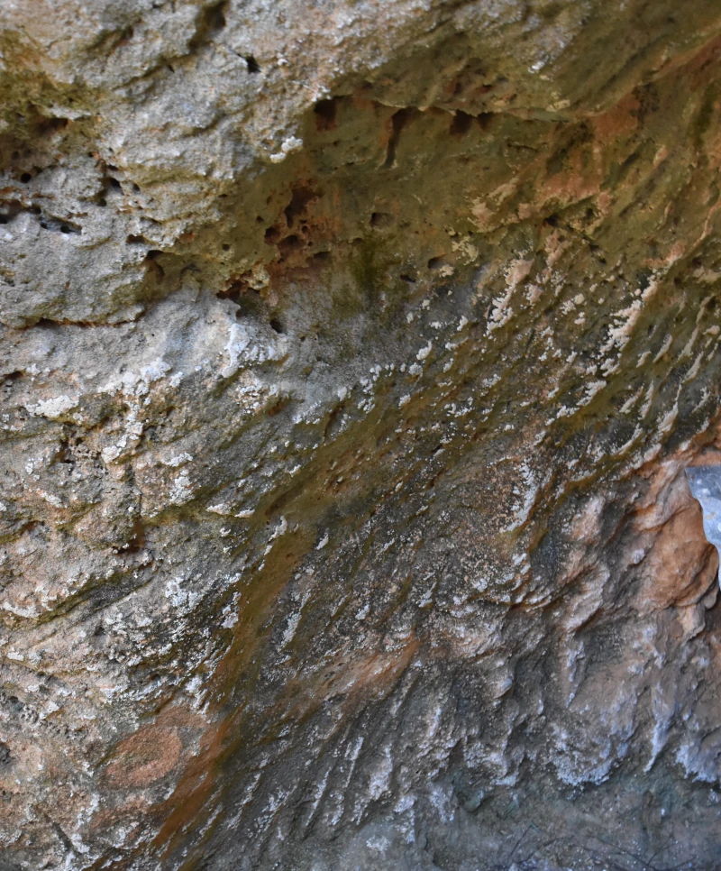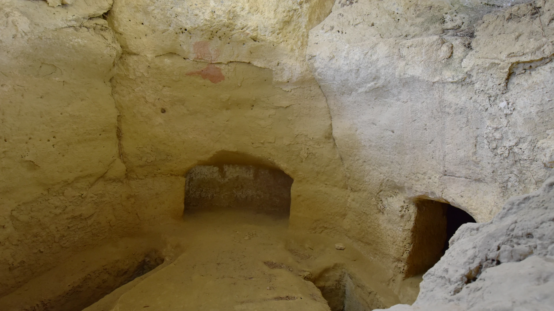 But the stand out tomb in this funereal landscape lies 150 metres in from the road and has three structural elements which confirms its Mycenaean provenance. To the North-East a 3 metre long passage way with elegantly tapering sides open to the sky allows sunlight to illuminate the smooth cut surface glowing orange in the afternoon light. This dromos, as archaeologists refer to these typical Mycenaean passage ways, leads you into a 2 metre hemispherical chamber cut into the rock to the South-West. This classifies our Proastio tomb as a ‘chamber tomb’. The chamber would have been dark before the partial collapse of its roof which now allows some light in. The internal walls are roughly hewn and show the grooves left by the bronze chisels and picks hafted onto wooden handles with which these early masons cut the soft limestone. The transition from the light passage into the dark chamber is through the stomion which in our Proastio example has been fashioned out of the rock face to present a smoothly cut apical triangle of stone beneath which the entrance has been opened in the shape of a head and shoulders. This presumably allowed some headroom to the living as they carried in the deceased. From other sites we know that ritual objects were buried in this liminal space marking the boundary between life and death. These include vessels presumably used in offering a libation to the gods, who already included Zeus and Poseidon, animal bones and food remains possibly related to sacrificial feasting. As the funeral monuments became grander the grave goods interred with the deceased in the chamber became more extravagant from small figurines to golden death masks.
